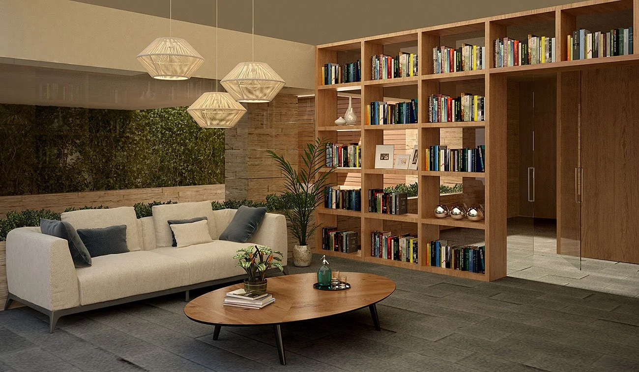 Departamentos 1 y 2 (Planta Baja): estos departamentos dúplex permiten a los inquilinos sentirse como en una casa, abriendo la sala a un patio privado y con una espectacular doble altura en la que una gran librería acompaña a la escalera de subida al segundo nivel.